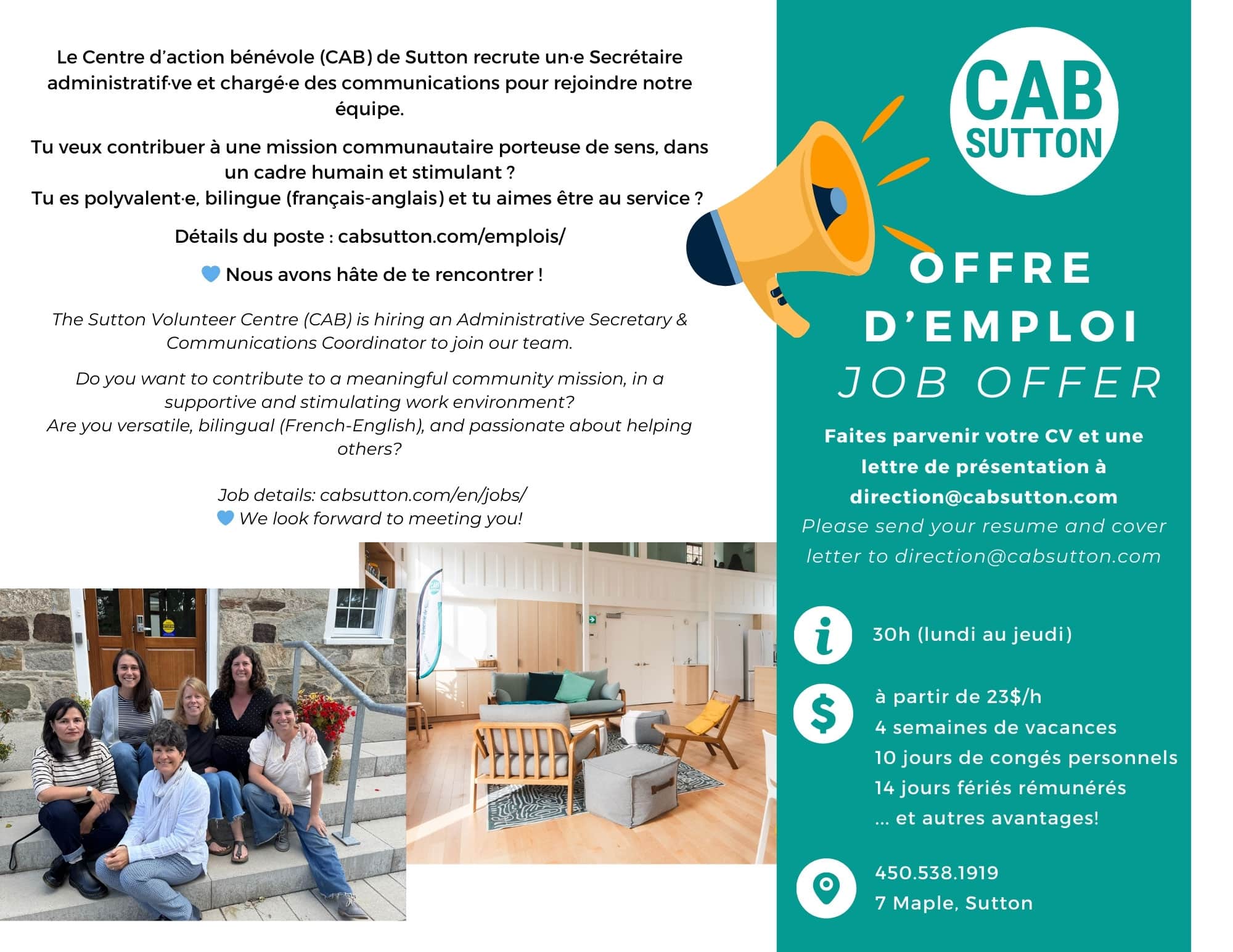Ancré dans les communautés de Sutton et d’Abercorn, le CAB Sutton est un organisme à vocation communautaire et social, s’appuyant en priorité sur l’action des bénévoles, qui dessert les personnes en situation de vulnérabilité, plus particulièrement les familles et les aînés et ce, en offrant du soutien et du référencement reliés à la sécurité alimentaire, le vieillissement, l’isolement social et l’éducation.