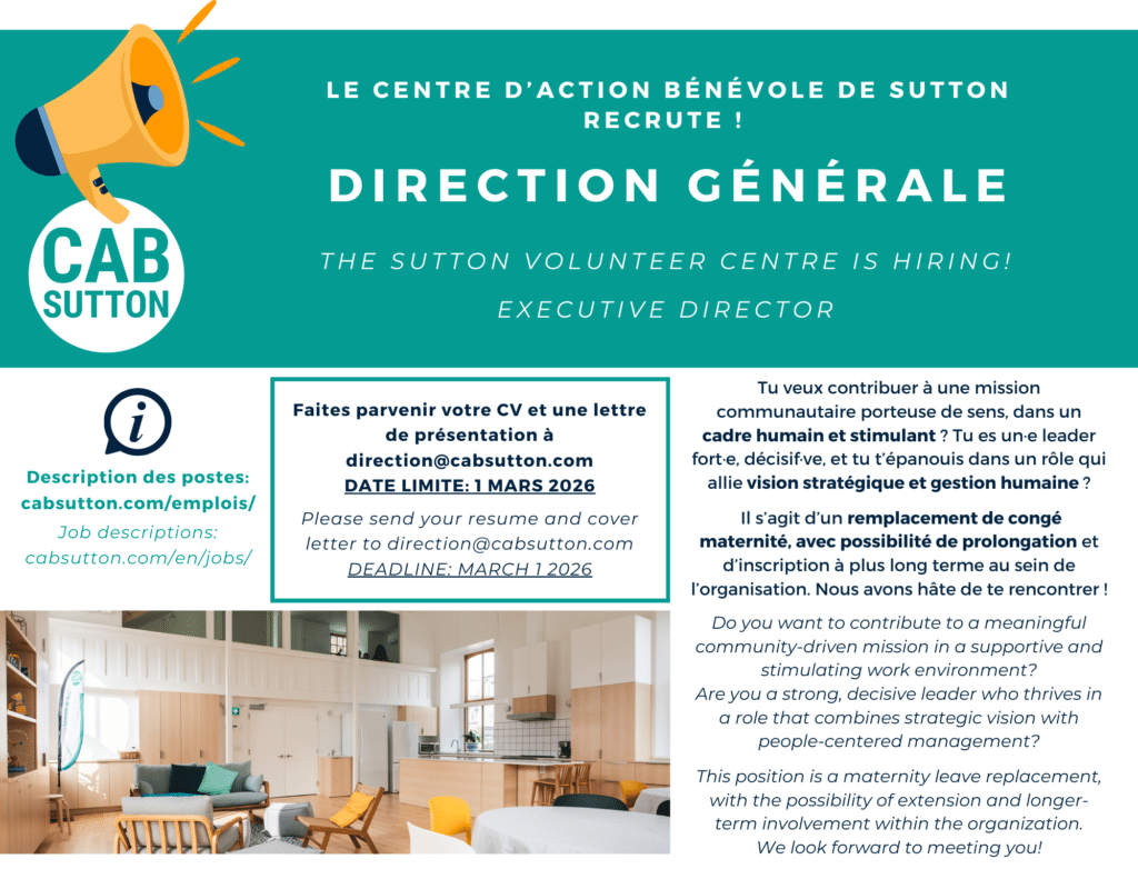 Joignez-vous à l’équipe du CAB Sutton ! Nous sommes à la recherche d’un.e adjoint.e administrative pour compléter notre dynamique équipe.