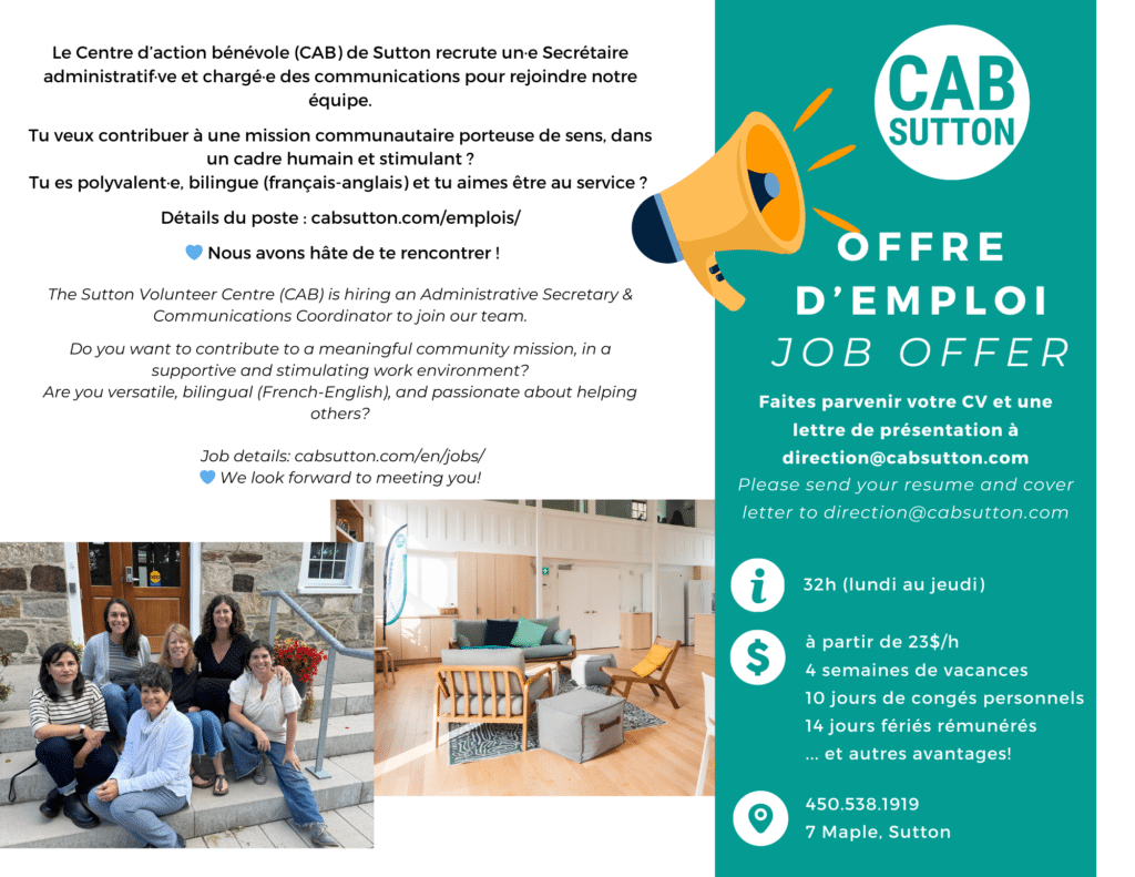 POSITION TITLE : Administrative Secretary and Communications Coordinator IMMEDIATE SUPERVISOR : Director ORGANIZATION’S MISSION Rooted in the communities of Sutton and Abercorn, the Sutton Volunteer Centre (CAB Sutton) is an autonomous community organization that relies primarily on volunteer involvement. It serves people in vulnerable situations, particularly families and seniors, by providing support and referrals in the areas…