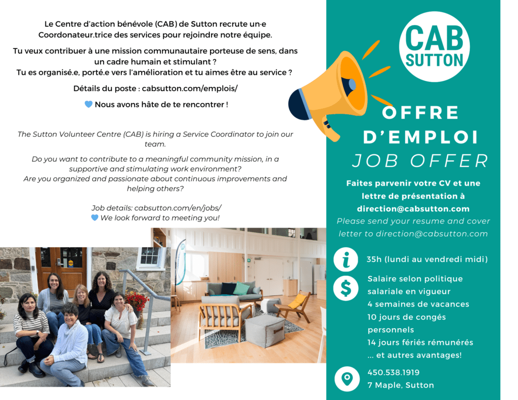 POSITION TITLE : service coordinator IMMEDIATE SUPERVISOR : Director ORGANIZATION’S MISSION Rooted in the communities of Sutton and Abercorn, the Sutton Volunteer Centre (CAB Sutton) is an autonomous community organization that relies primarily on volunteer involvement. It serves people in vulnerable situations, particularly families and seniors, by providing support and referrals in the areas of food security,…