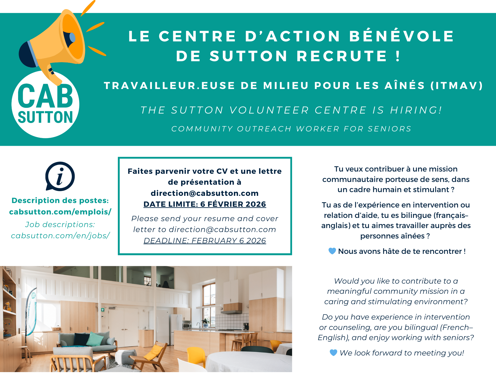 The Outreach Worker also contributes to administrative follow-ups, accountability and reporting requirements, and team life, in alignment with the mission and action plan of CAB Sutton and the objectives of the ITMAV program.
