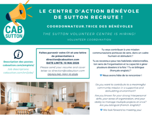POSITION TITLE : volunteer coordinator IMMEDIATE SUPERVISOR : Director ORGANIZATION’S MISSION Rooted in the communities of Sutton and Abercorn, the Sutton Volunteer Centre (CAB Sutton) is an…
